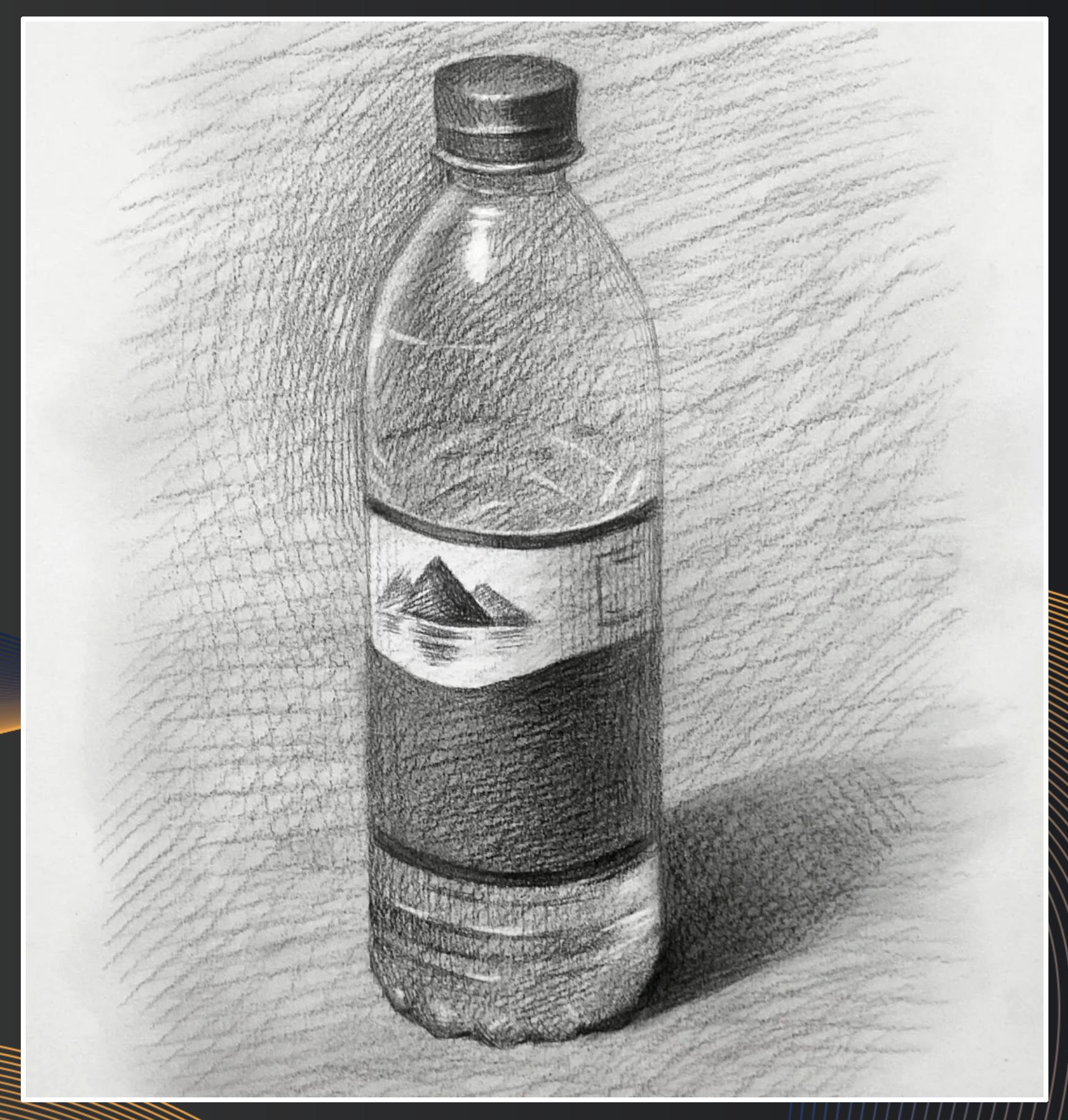 知识目标:观察并了解塑料瓶的形体结构,基本比例关系。技能目标:掌握塑料材质的表现技巧,能精准定位高光与反光位置,通过明暗对比强化半透明质感,区分瓶身与标签的不同质感差异。行为目标:通过对半透明塑料材质的理解与绘画,培养观察能力,引导学生细致观察物体的结构、光影与质感,提升对形态细节的敏感度。应用目标:将本次学习的 “几何形概括法”、“明暗塑造法” 应用到其他日常静物的素描创作中。
