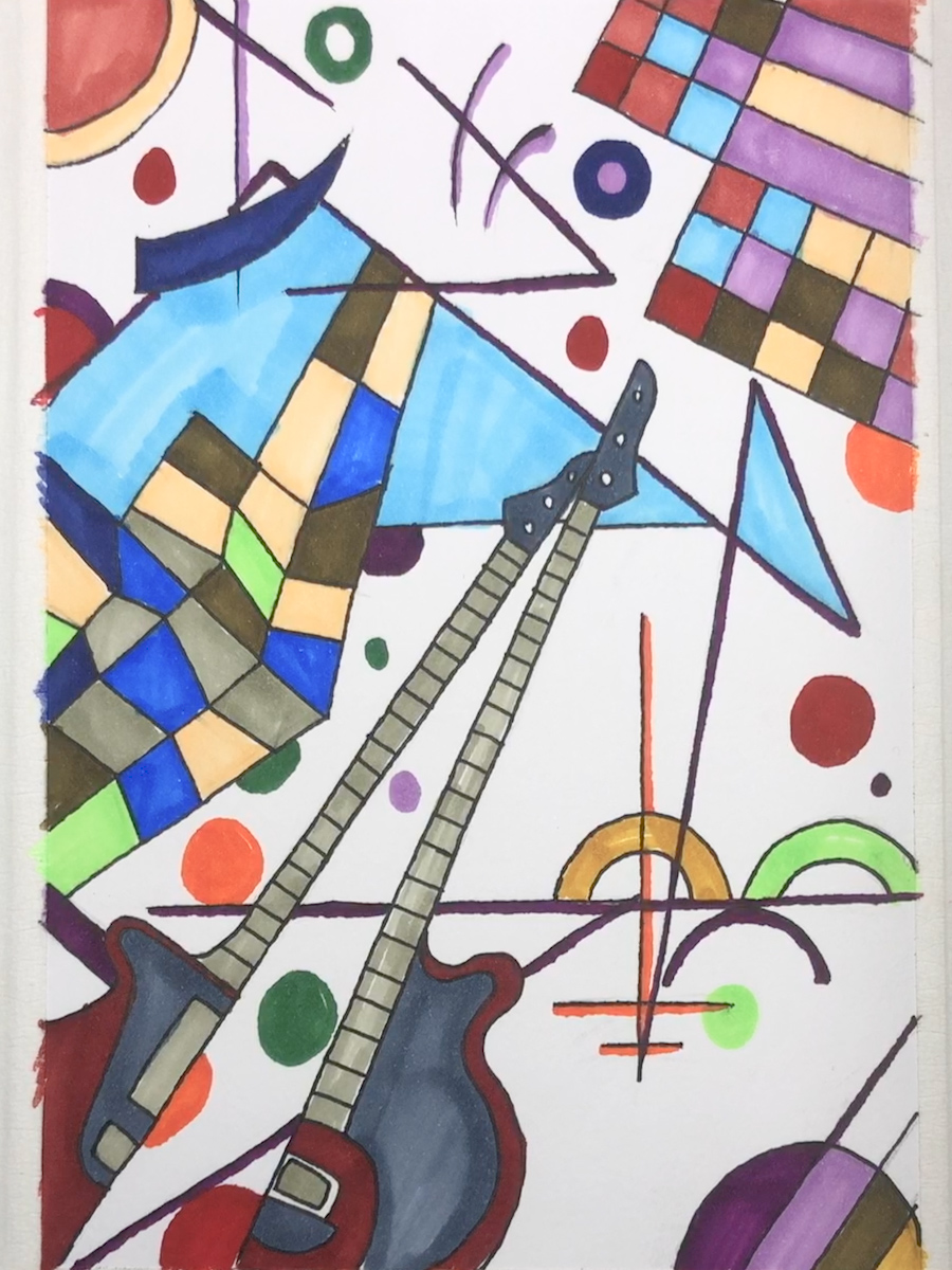 知识目标:了解现代抽象主义的产生与影响,鉴赏艺术家瓦西里·康定斯基。 技能目标:运用点、线、面元素结合音乐进行绘画创作。 情感目标:用绘画谱曲,画出内心的声音。