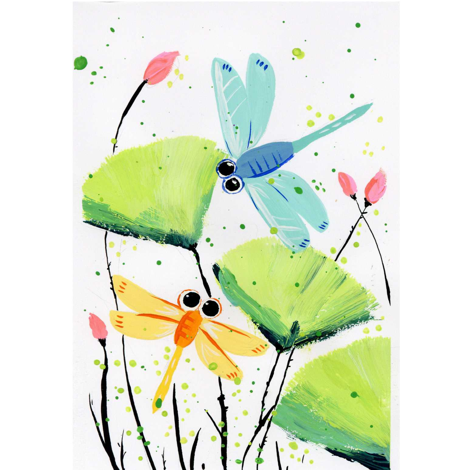 2.技能目标:通过观察蜻蜓特点,利用平涂法和水的控制设计创作蜻蜓